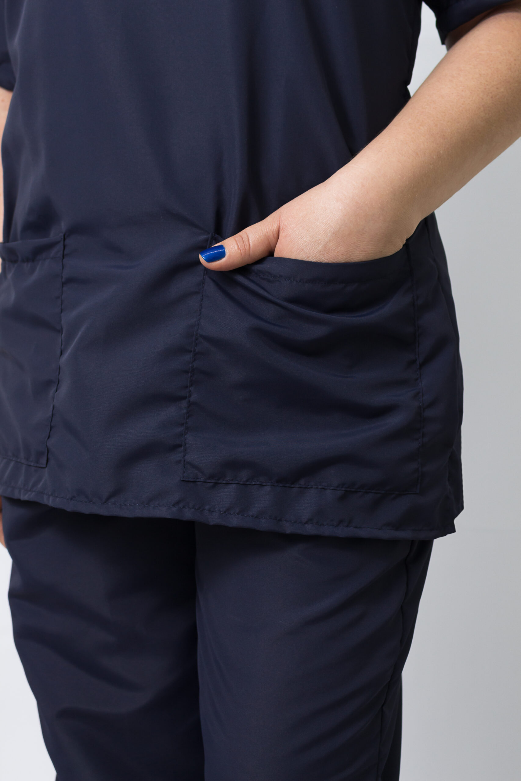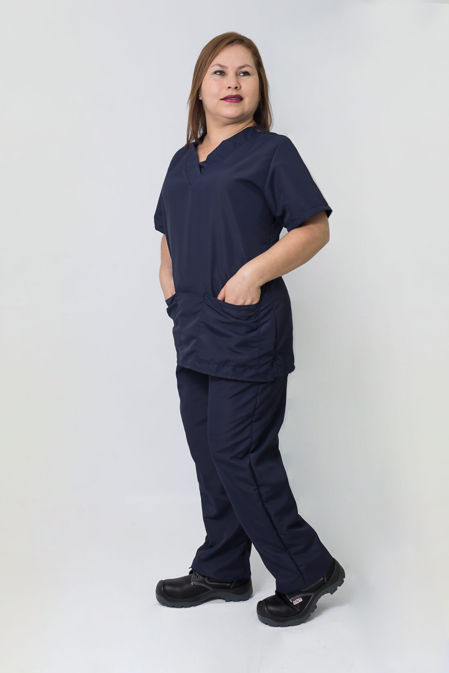 El diseño incluye una camiseta tipo blusa con manga corta y cuello en V, cómoda y funcional, combinada con un pantalón recto con pretina resortada, que brinda ajuste óptimo y libertad de movimiento.