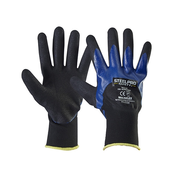 Tejido 100% en poliéster flexible negro Bañado laminado de nitrilo con recubrimiento adicional en palma y falanges Recubrimiento doble en ¾ de la mano en lámina de nitrilo color azul + capa sandy rugosa en color negro Resistentes a la abrasión y químicos Buen agarre con alta destreza y durabilidad Para uso con aceites y grasas Ideal en mantenimientos y aplicaciones húmedas Certificado EN 420: 2003 Certificado EN 388